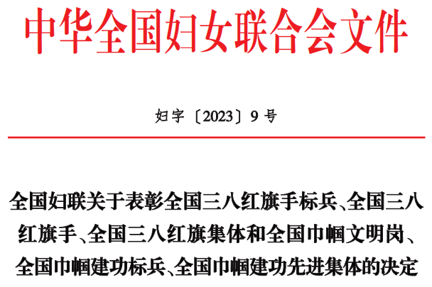 近日,中华全国妇女联合会印发《全国妇联关于表彰全国三八红旗手标兵、全国三八红旗手、全国三八红旗集体和全国巾帼文明岗、全国巾帼建功标兵、全国巾帼建功先进集体的决定》(妇字〔2023〕9号),555000jcjc公海控股集团办公室行政部上榜,获评“全国巾帼文明岗”。